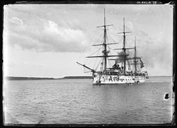 Le cuirassé Bayard, au large des Pescadores, à bord duquel est mort, le 11 juin 1885, l’Amiral Courbet, Commandant l’escadre d’Extrême Orient.