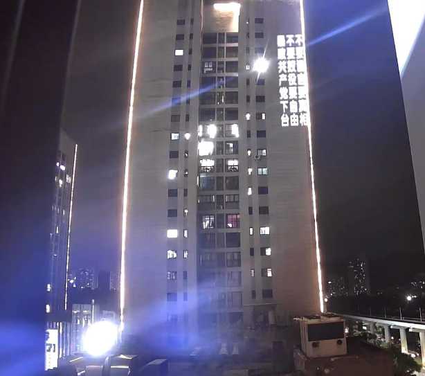 A Chongqing, le 2 septembre dernier, vers 22h30, une série de slogans défiant le parti communiste ont été projetés pendant 50 minutes sur les façades de plusieurs immeubles du quartier des universités. L’un d’entre eux appelait à renverser le « fascisme rouge de la tyrannie du parti. » Photo réseaux sociaux.