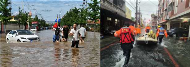 A gauche une rue de Miyun, au Nord de Pékin le 29 juillet. Photo : AFP. A droite les pompiers de Tainan en mission d’évacuation le 2 août. Photo pompiers de Tainan.