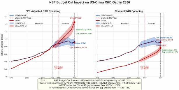 Le graphe produit par rdworldonline montre la projection à 2030 des écarts des budgets de R&D entre la Chine et les Etats-Unis ajustés en parité de pouvoir d’achat à gauche et en valeur nominale à droite.