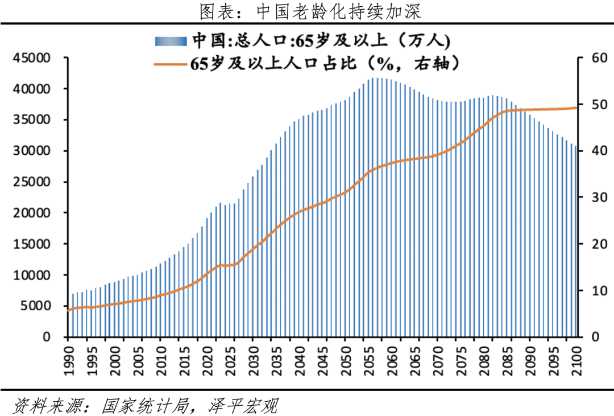 Le vieillissement de la population chinoise est un phénomène significatif. Selon les données du Bureau national des statistiques qui produit ce graphe, en 2024, le nombre des personnes âgées de 60 ans et plus a dépassé les 290 millions, soit plus de 21% de la population totale. Le BNS prévoit un vieillissement accéléré à partir de 2035 (la proportion de personnes âgées de 65 ans sera proche de 30%). En 2100, la projection évalue la proportion à 50%.
