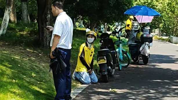 Publiée par le South China Morning Post, la photo extraite des réseaux sociaux du livreur agenouillé devant le garde de sécurité à Hangzhou.