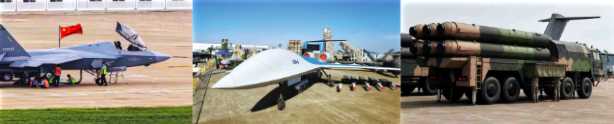 De gauche à droite le J-35. Le drone CH 6 et les missiles anti-aériens HQ-19.